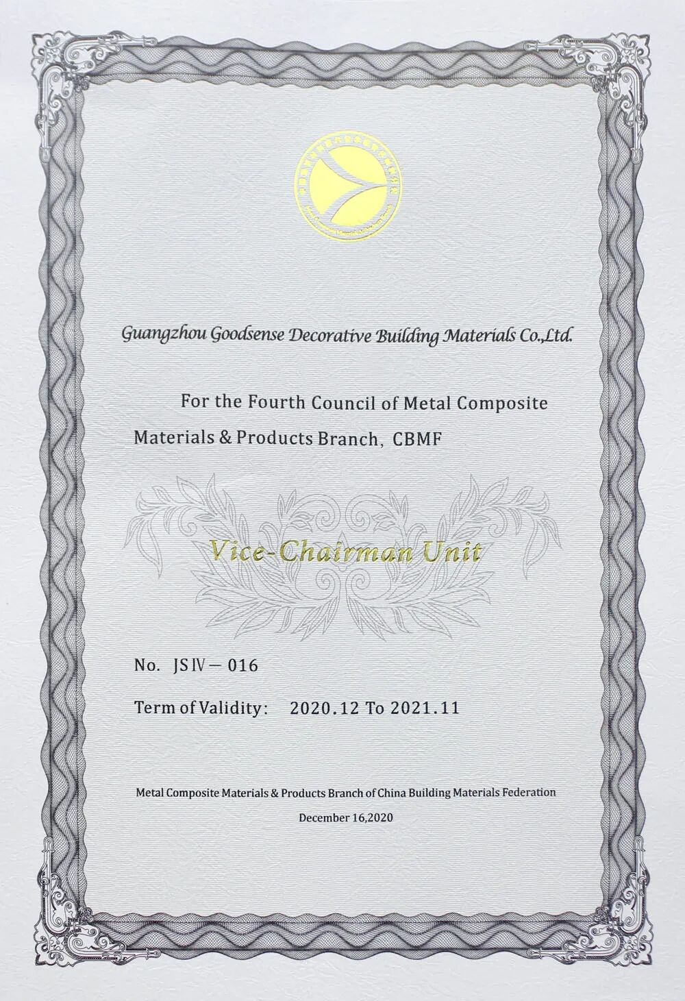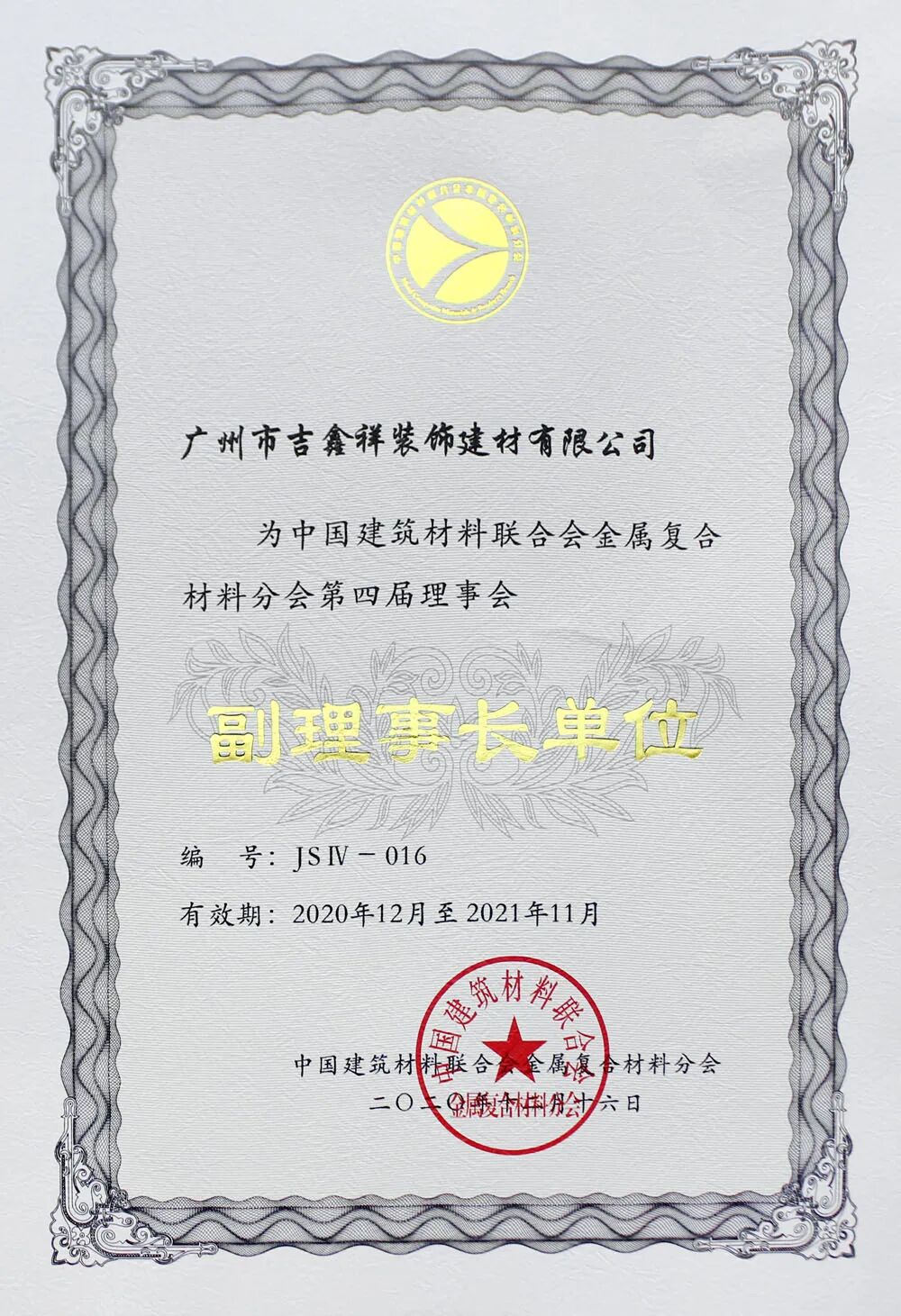 祝賀:廣州市吉鑫祥裝飾建材有限公司 再次成為 中國建筑材料聯合會金屬復合材料分會第四屆理事會 副理事長單位!